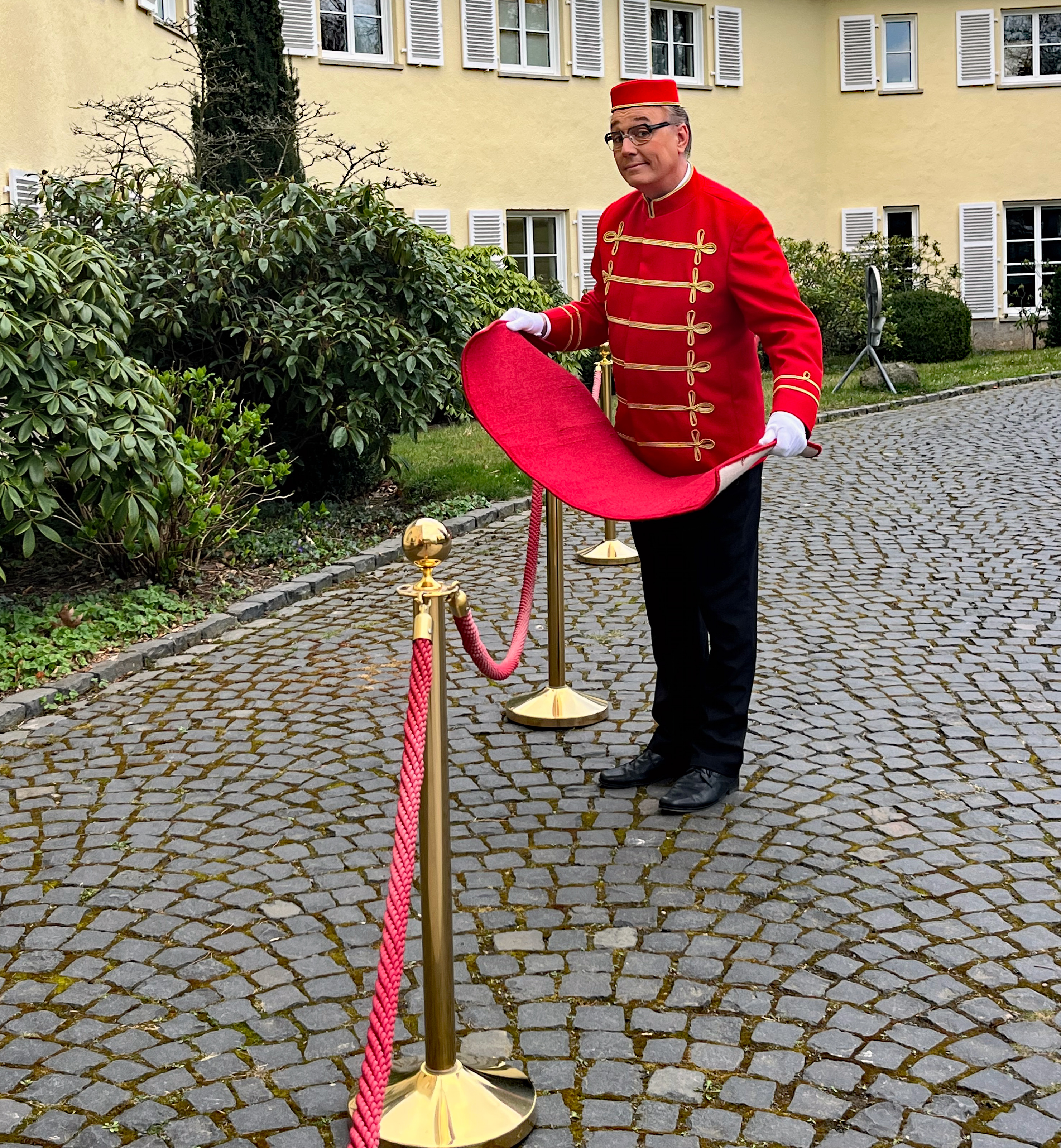 Spontan kommen rote Teppiche und weitere Requisiten zum Einsatz. Die Unterhaltungskünstler heißen Gäste humorvoll